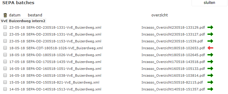 ![]() De incassobestanden herkent u aan het groene pijltje naar rechts, de betaalbestanden aan het rode pijltje naar links.