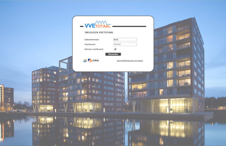 Als u deze URL heeft ingevoerd in uw Internet-browser, verschijnt het aanmeldscherm van VvEtotaal, bijvoorbeeld: