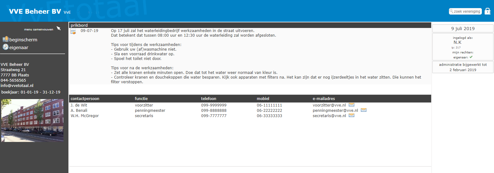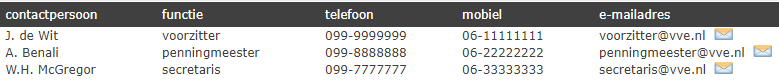 De beheerder kan op het beginscherm een lijst publiceren van de contactpersonen van de VvE.