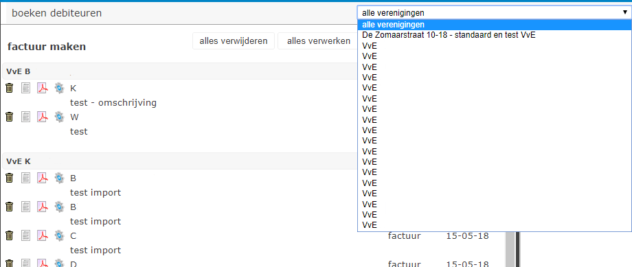 Let op: als u bovenin de keuzelijst VvE's heeft gekozen voor alle verenigingen, dan verwijdert de knop selectie verwijderen alle voor verwijderen geselecteerde facturen voor alle getoonde VvE's. Als u in de keuzelijst VvE's heeft gekozen voor een specifieke VvE, dan worden alleen de geselecteerde facturen van deze VvE verwijderd.