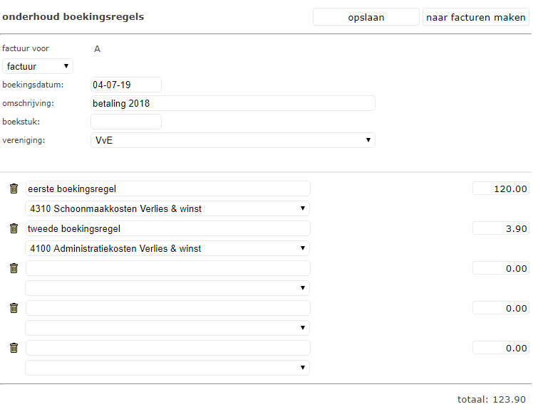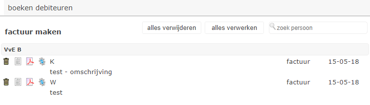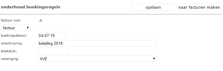 U ziet in het scherm factuur maken dan alleen de nog niet verwerkte facturen voor de actieve VvE. In dit geval heeft u ook geen keuzelijst met VvE's bovenaan het scherm: